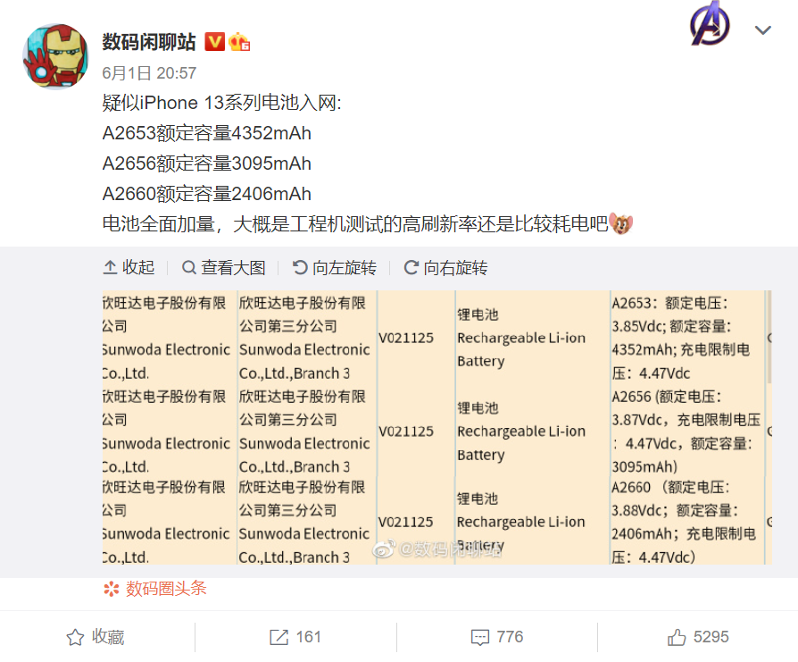 知名微博博主「數碼閒聊站」幾天前就貼出了一張截圖,上面有著三款電池的入網資料,疑似就是 iPhone 13 系列的三款電池。